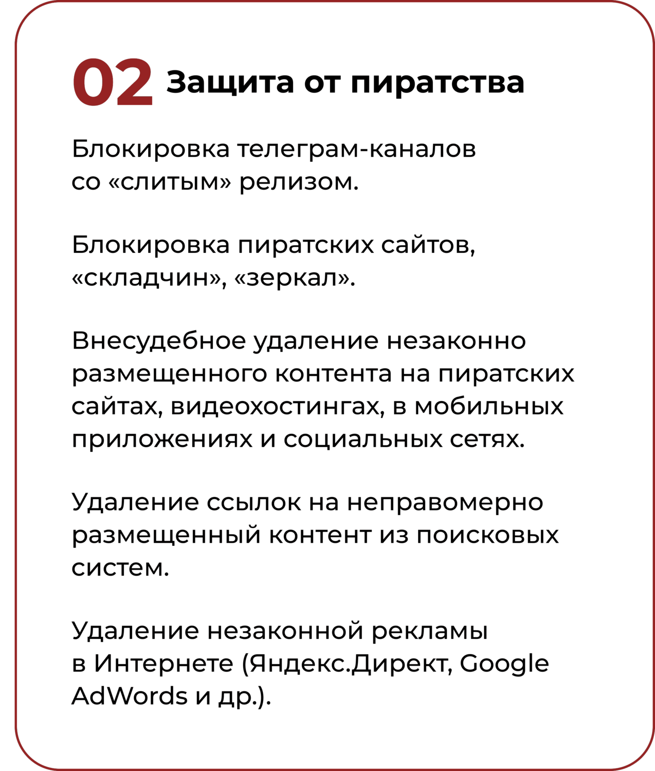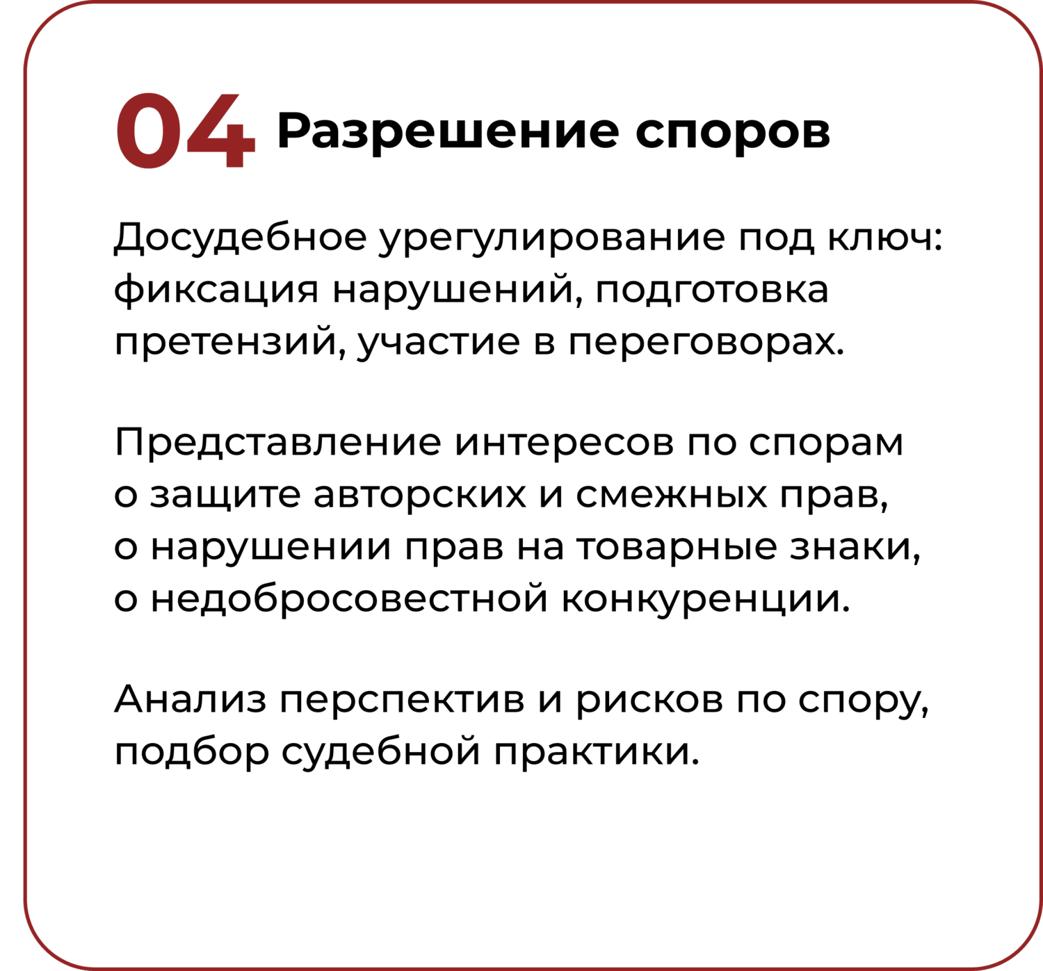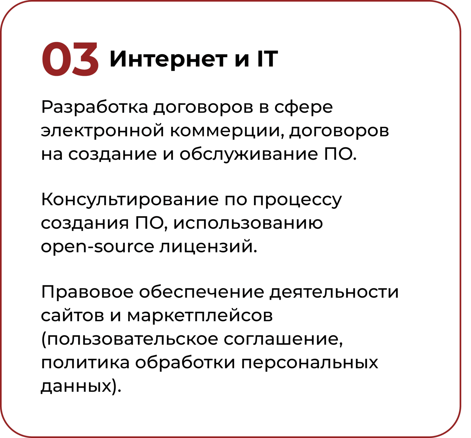 Наша команда специализируется на обеспечении защиты авторских прав в сфере информационных технологий. Мы предоставляем широкий спектр юридических услуг, связанных