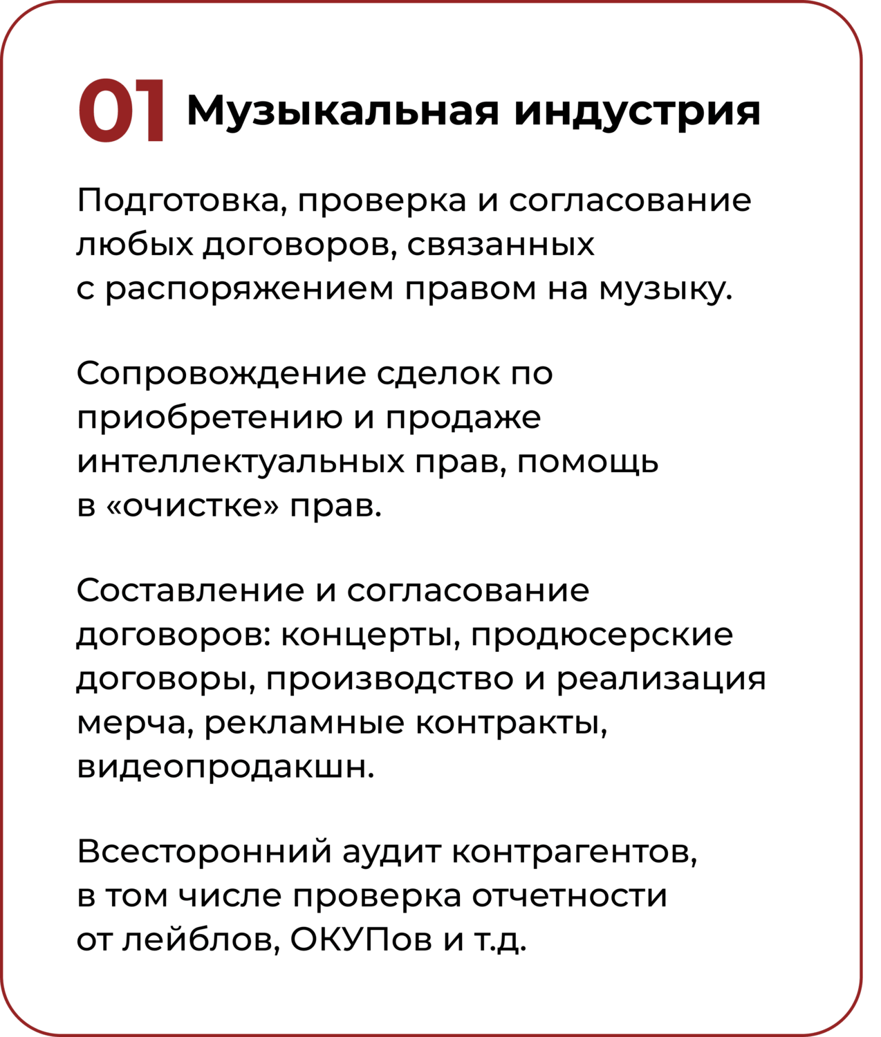 с авторским правом, включая составление любых видов договоров, защиту авторских прав в судебных процессах, а также помощь в урегулировании споров, связанных с авторским правом.